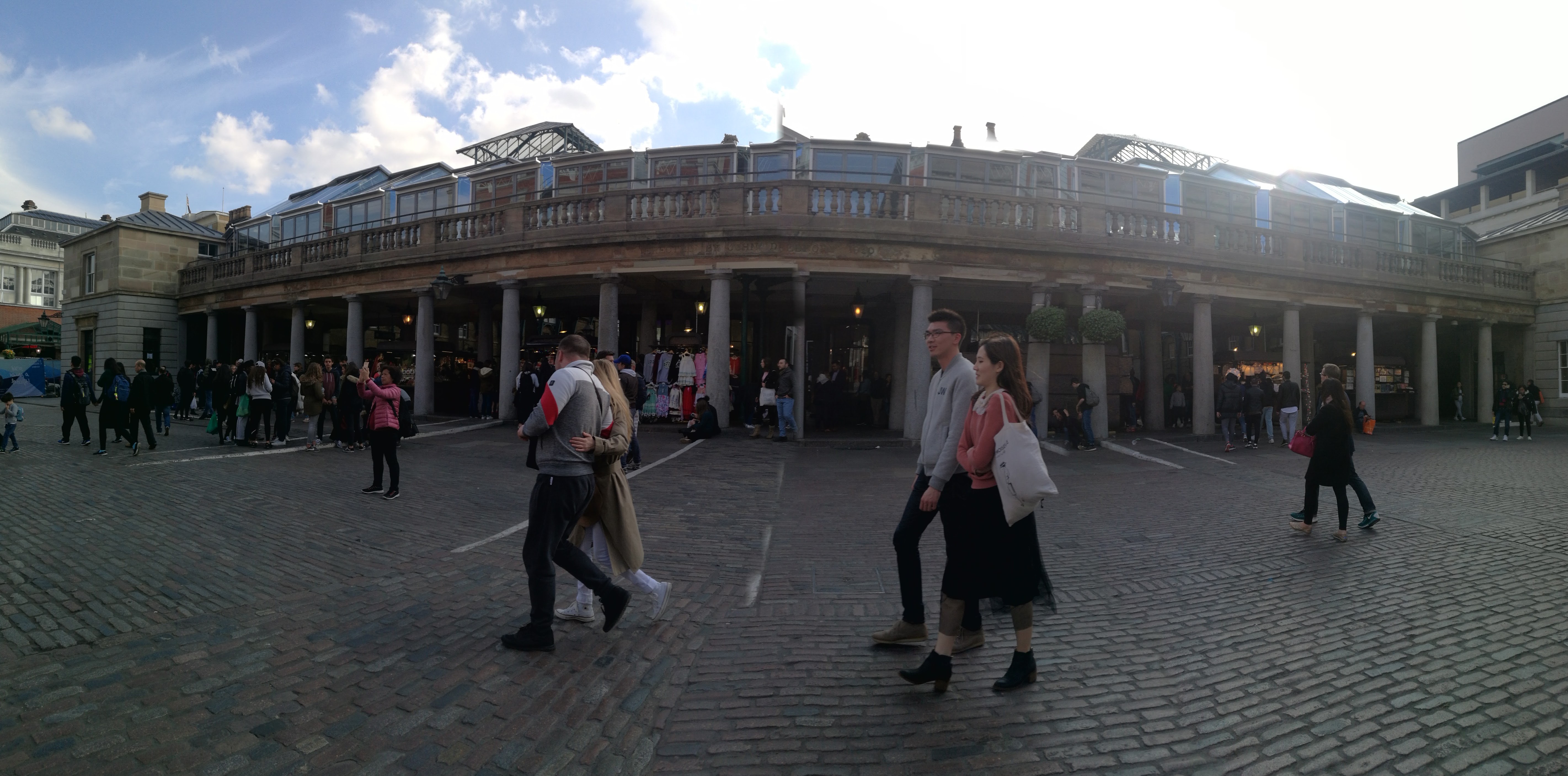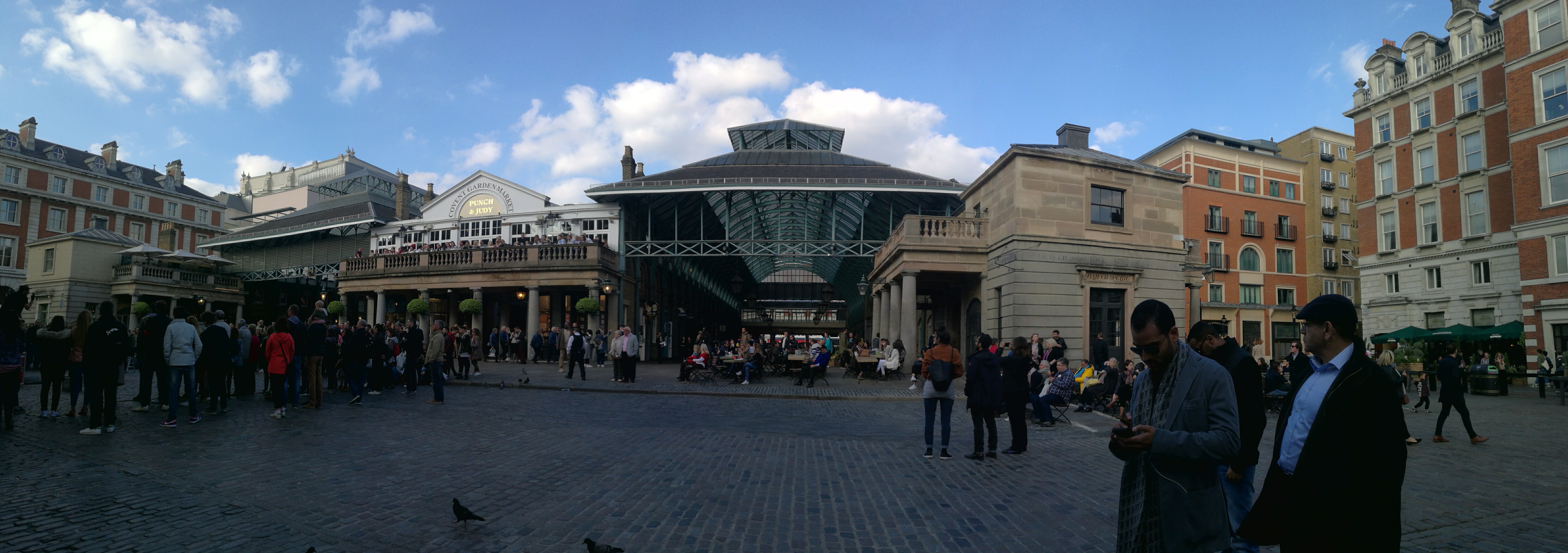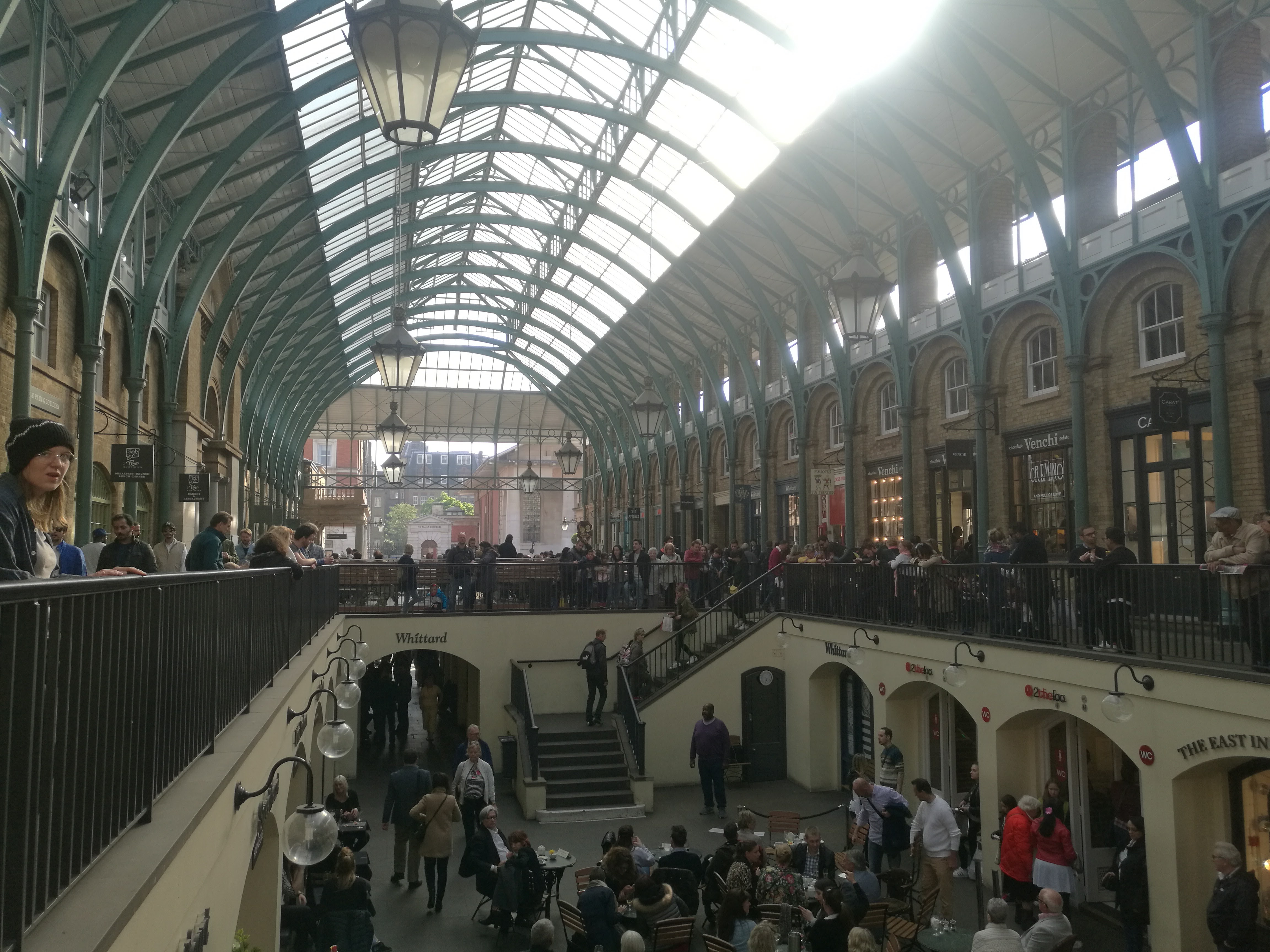 Covent Garden es todo, menos un mercado; tiene su zona donde sí, hay puestos de diferentes ventas; desde cuadros, recuerdos, hasta dulces de todos los lugares, carteras y otras cosas para llevar a casa; pero la zona donde hay más cosas y la impresión de ser un invernadero está lleno de tiendas de las marcas más famosas del mundo. Además, la planta baja, tiene diferentes cafés para elegir estar un rato ahí. Puede que porque haya sido domingo el lugar estuviese más lleno y además, había música en vivo.