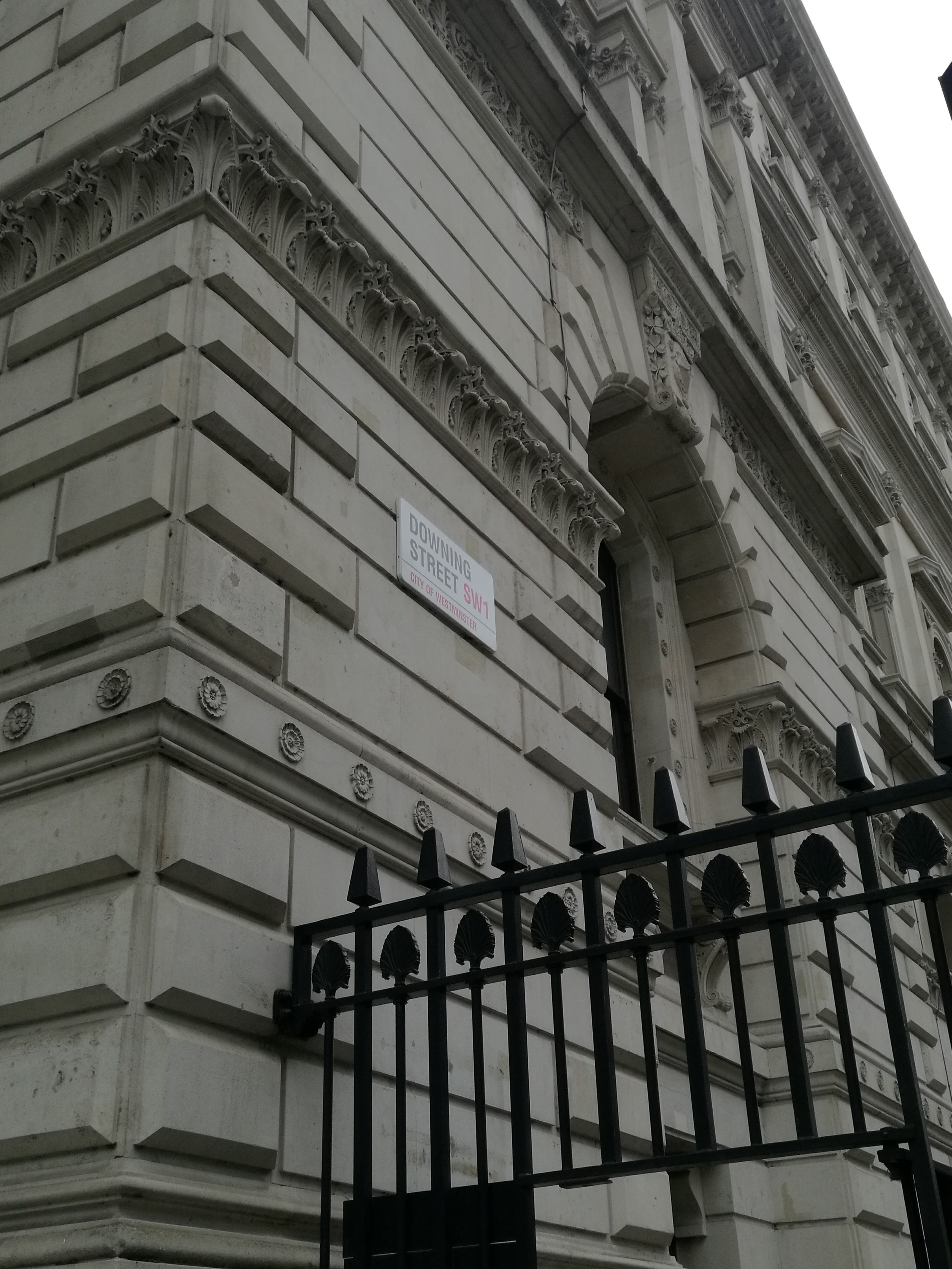 Estando ahi y sacando un par de fotos al edificio y a los busitos tradicionales de la ciudad logré escuchar una de las últimas campanadas que iba a dar Big Ben de aquí como a 4 años porque está en reparación; de ahi decidí seguir caminando en dirección a Parliament sq garden, porque vi que ahi cerquita estaba mi siguiente destino; 10 downing street, el cual está en una calle privada, entonces solo se puede ver el rótulo de la calle (lamento no haber comprado uno de estos como souvenir, ahora lo tendría en mi casa…).