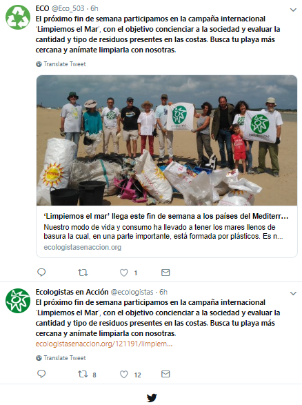 Aquí estamos hablando más allá de las peleas de «me copió el tweet» para ganar likes y RTs. Estamos hablando de que hay cuentas que pagan por servicio de copia de contenido. La cuenta A publica o retuitea algo a las 9:00am y la Cuenta clon A publica el mismo contenido, como propio a las 9:05am del mismo día. Ahora bien, no cuesta buscar si tu contenido o el de otra cuenta es contenido clonado, solo es de copiar una de las frases que aparecen en los tweets «propios». Como por ejemplo la de @Eco_503 «El próximo fin de semana participamos en la campaña internacional ‘Limpiemos el Mar’, con el objetivo concienciar a la sociedad y evaluar la cantidad y tipo de residuos presentes en las costas.» ¿Qué respuesta nos da el search… pues vean aquí… Ambos tweets se publicaron a la misma hora, con segundos de diferencia