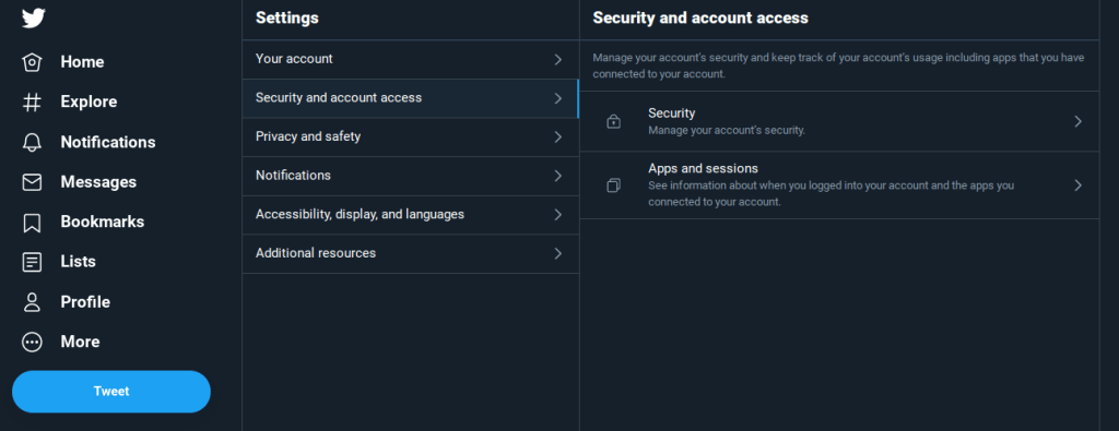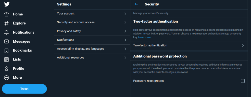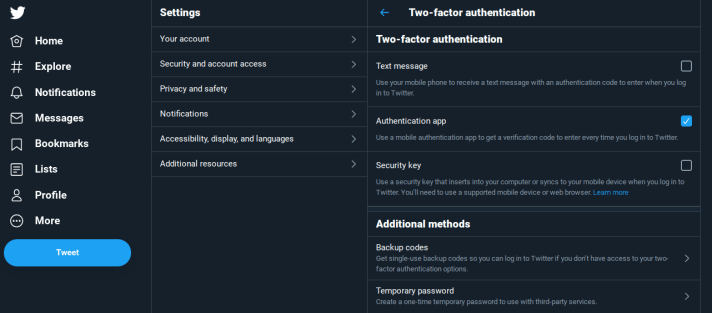 Desde su cuenta de twitter en la web, se van a la barra lateral donde se encuentra su perfil y podrán ver el item de ajustes y privacidad. Al clickear ahí se va a desplegar el siguiente menu donde podrán ver las opciones de seguridad de su cuenta, dentro de estas está la autenticación de dos pasos, o en inglés two step verification.