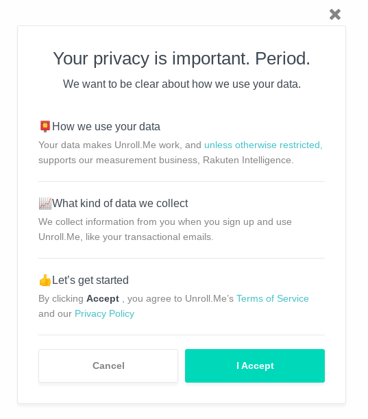 Luego de ahí deberán registrarse con el correo que desean revisar las suscripciones, además deberán de implementar la seguridad que sugiere la plataforma: verificación de dos pasos y una clave para la app de unroll.me (esto asegura que solo se puede ingresar a la app y a tu data si tienes el pin de verificación de dos pasos y el de la aplicación). Igualmente pueden asegurar en la página de privacidad, el uso de los datos que uno está entregándole a la aplicación y luego de ocuparla, puedes cancelar tu cuenta.