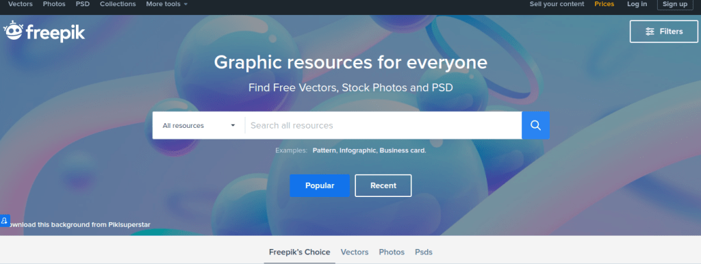 Este es el favorito de muchos, tiene fotografías, vectores, íconos y otros recursos para poder trabajar de manera gratuita en programas como ilustrador, photoshop y otros. Las limitantes que tiene es que puedes descargar un máximo de 3 recursos de manera gratuita sin tener que loggearte o crear usuario. Al momento de crear un usuario y loggearte puedes descargar un máximo de 10, según su sitio de support. Si son para uso comercial, debes de dar crédito al autor del recurso utilizado.