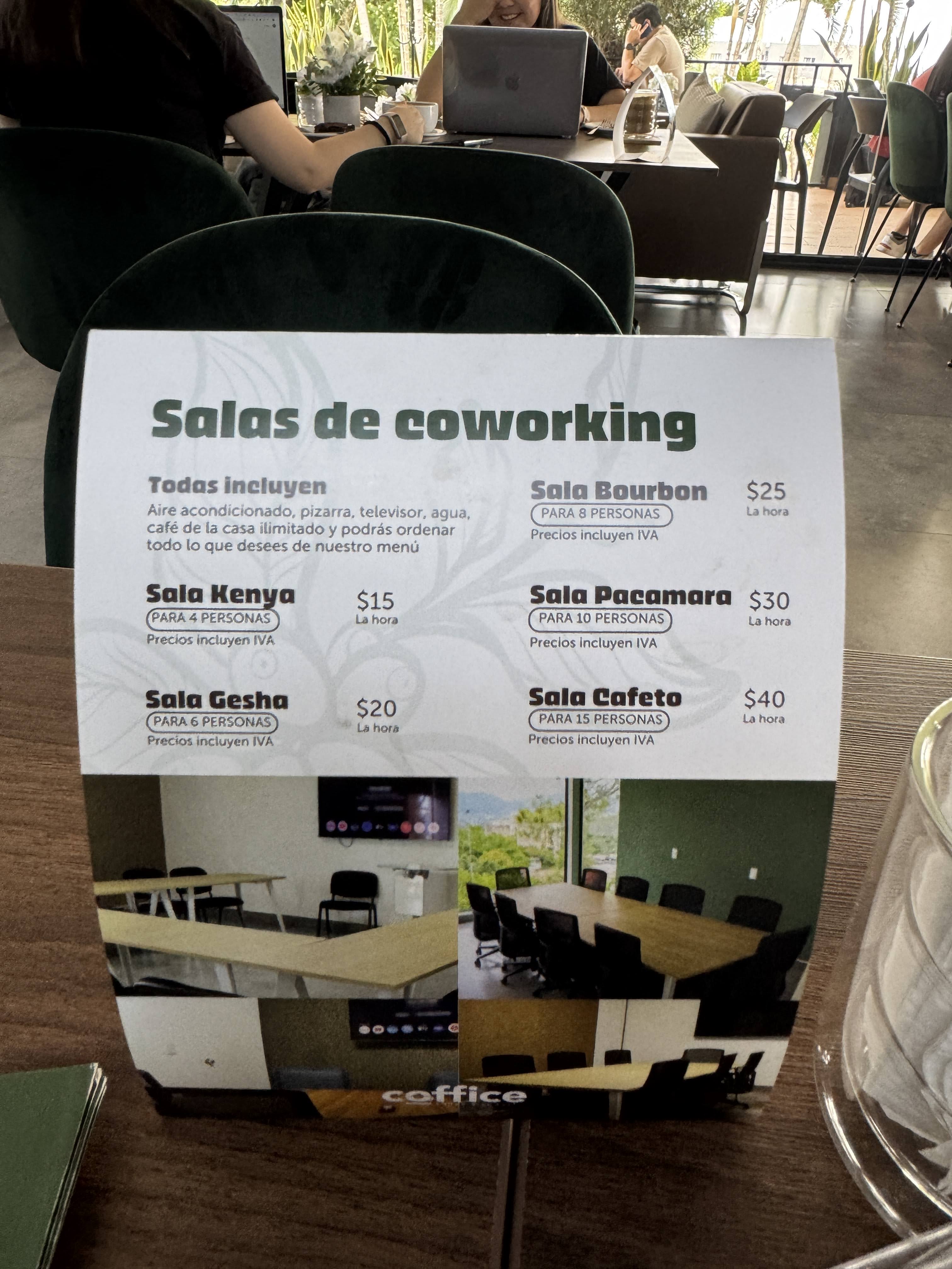 Ya cuando hablamos de trabajar, tiene un internet de 45 megas de descarga y aproximadamente 10 megas de subida, lo cual es super bueno para poder estar trabajando en línea. Las mesas que están hacia la pared en la entrada tienen conector de corriente, igual una de las mesas de la glorieta y una que está por la barra de cocina. No tienen aire acondicionado en la parte abierta, sin embargo tienen ventiladores y la manera en la que está distribuido todo, tiene un buen flujo de aire. Además, tienen un salón para eventos, que tiene aire y pantalla de TV para poder hacer proyecciones.