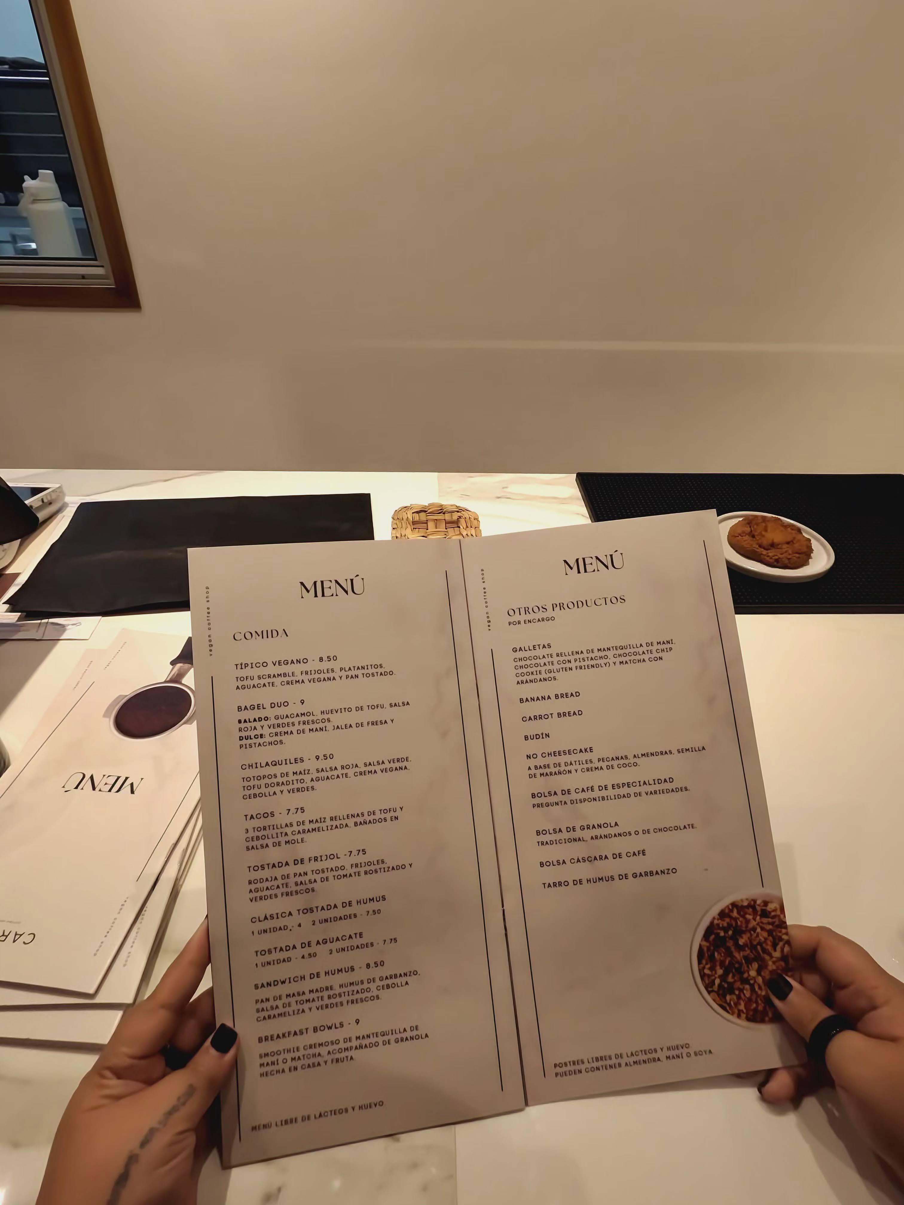 El menu es bastante completo a nivel de bebidas y comida. Tienen las tradicionales bebidas de café: latte, capuchino, americano, pero también tienen café de métodos (V60, Chemex, prensa francesa, etc) y matcha, que parece ser su bebida ganadora y tienen opciones veganas, sugar y gluten free.